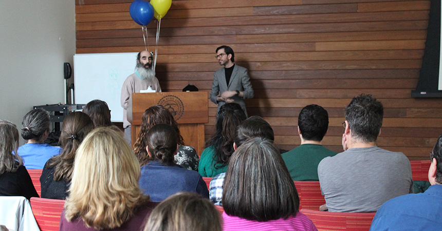 “This award is given to two of our colleagues and they will deliver the lecture today,” Emily Soltano, professor of psychology and director of the CTL, said at the start of the event. “But this also is an opportunity for us to celebrate all of our faculty and I applaud all of you who are here in the room, and all the colleagues that we work with throughout the year.”