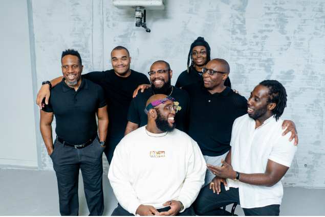 The artists of “The Miracle Machine: A Black Male Artists Think Tank,” from left, visual artists Imo Nse Imeh, JaJa Swinton, Kahli Hernandez, and Xavier Merkman, with poet Aaron Joseph St. Louis, musician Kevin D. Mason, and Omarthan Clarke. (Photography by Darrius Mylze Johnson)