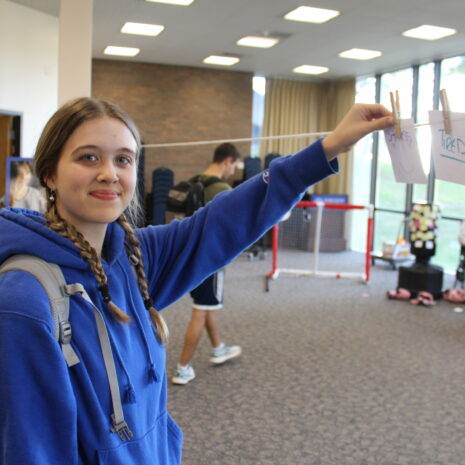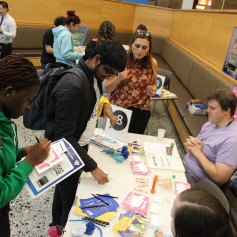Students who visited the At Ease booth, which focused on support for students who serve or have served in the military, were invited to write a note for a veteran and to visualize how difficult it is to manage numerous challenges without support by trying to submerge more than a dozen ping pong balls in a bucket of water. At the Be Yourself booth, sponsored by the LGBTQ+ Alliance, visitors wrote affirmations and messages of support on colored strips of paper that would be linked together in a rainbow-colored chain.