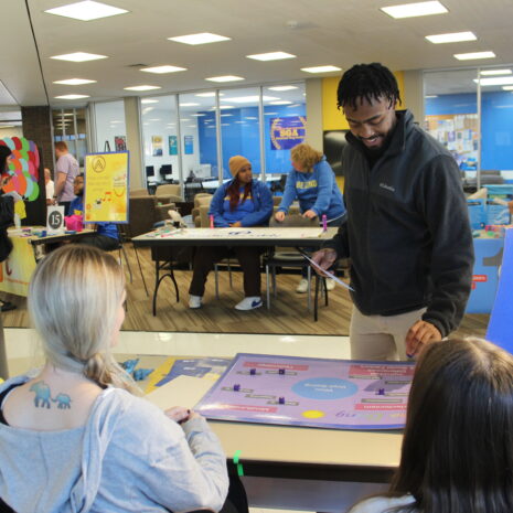 This year, more than 450 students—100 more than last year—visited 15 interactive booths focused on everything from food insecurity and the benefits of exercise in improving mood to prevention of domestic violence and sexual assault and the importance of self-care. Along the way, they got a card stamped by all the booths they visited, to be entered into a raffle for a chance to win Beats headphones and other prizes.