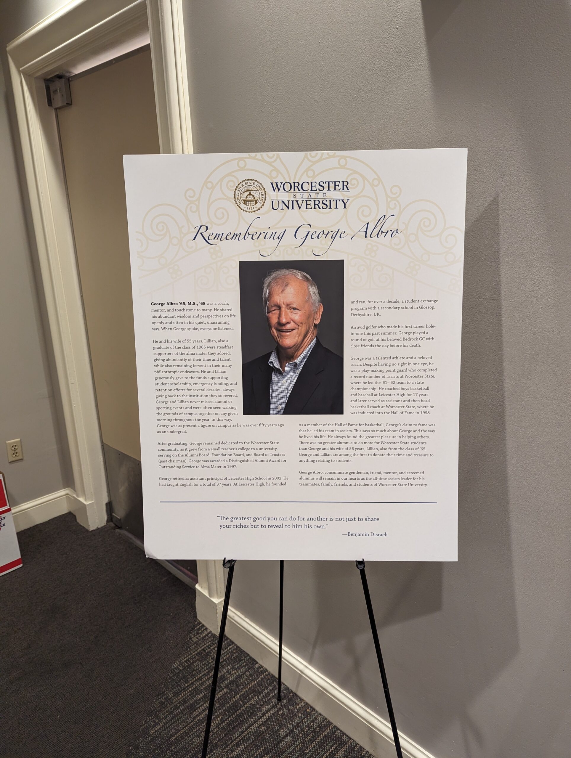 Previously known as the Lancer Tournament, it was renamed in 2022 in honor of George Albro, a dedicated Worcester State alumnus, educator, and coach who passed away in 2021. Worcester State Athletics Director Mike Mudd described Albro as “synonymous with Worcester State Athletics.” He played basketball as a Lancer from 1961 to 1965, winning a championship with the team in the 1961-62 season. Albro later returned to Worcester State as a basketball coach, and was inducted into the school’s Athletics Hall of Fame in 1989.