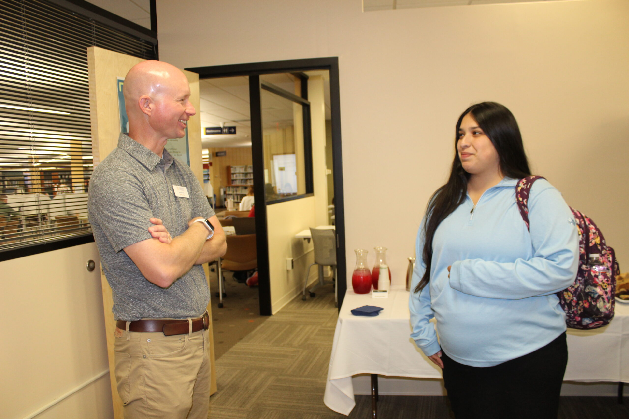 Photos: Worcester State’s new coordinator for spiritual life Andy Haynes meets with members of the university community during a recent open house for the Spiritual Life Prayer and Meditation Lounge. (Photos by Nancy Sheehan)