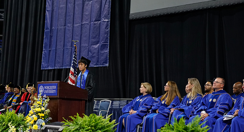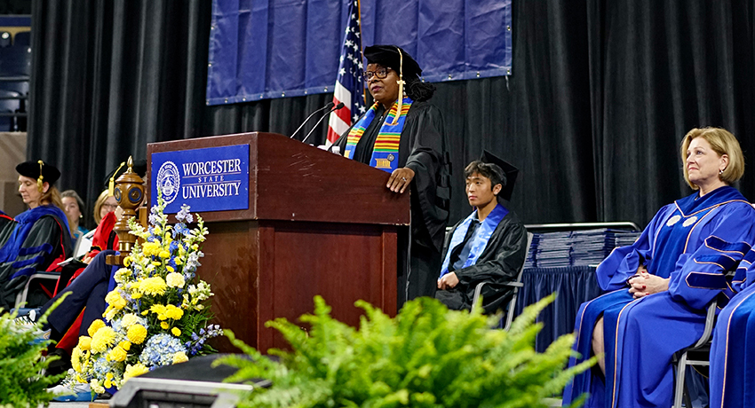 Commencement speaker Dr. Maddox ’82 emphasized the transformative power of a Worcester State education and encouraged the graduates to apply the values and skills they gained to make a positive impact on the world.
