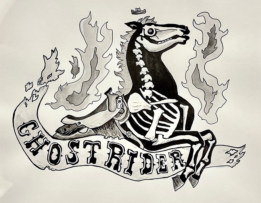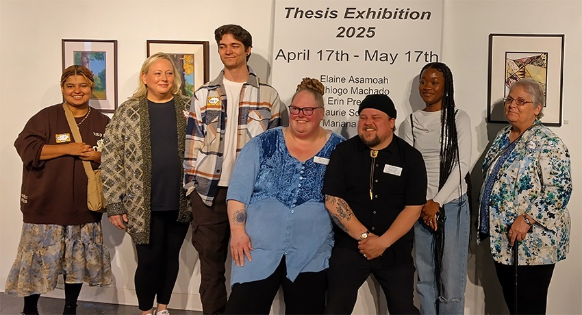 Photos from left: Student Thesis artists and professors – Mariana Velez, Erin Preston, Dhiogo Machado, Professor Stacey Parker, Professor Brad Chapman, Elaine Asamoah, and Laurie Schlatter; “Ghost Rider” by Taylor Kochinskas; and Untitled by Sreypich Phoeuk