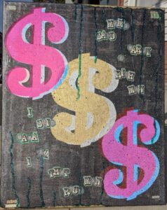 “Portrait of Prosperity,” Webb’s third work, featuring bright pink and gold dollar signs, brings the artist back to childhood days when Andy Warhol served as “the first really big influence.” The art gives a nod to Warhol’s style and “solidifies how me and my own gender could provide for myself,” particularly following a childhood in a conservative region of the south, Webb said.