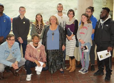 Marcellinus Okhakhu, second from left, is joined by, from left, Jean Borgatti, Ph.D., from Clark University, who served the University of Benin as a Fulbright scholar, Dean Russ Pottle, Ph.D., and Adam Zahler, MFA, chair of the Department of Visual and Performing Arts.